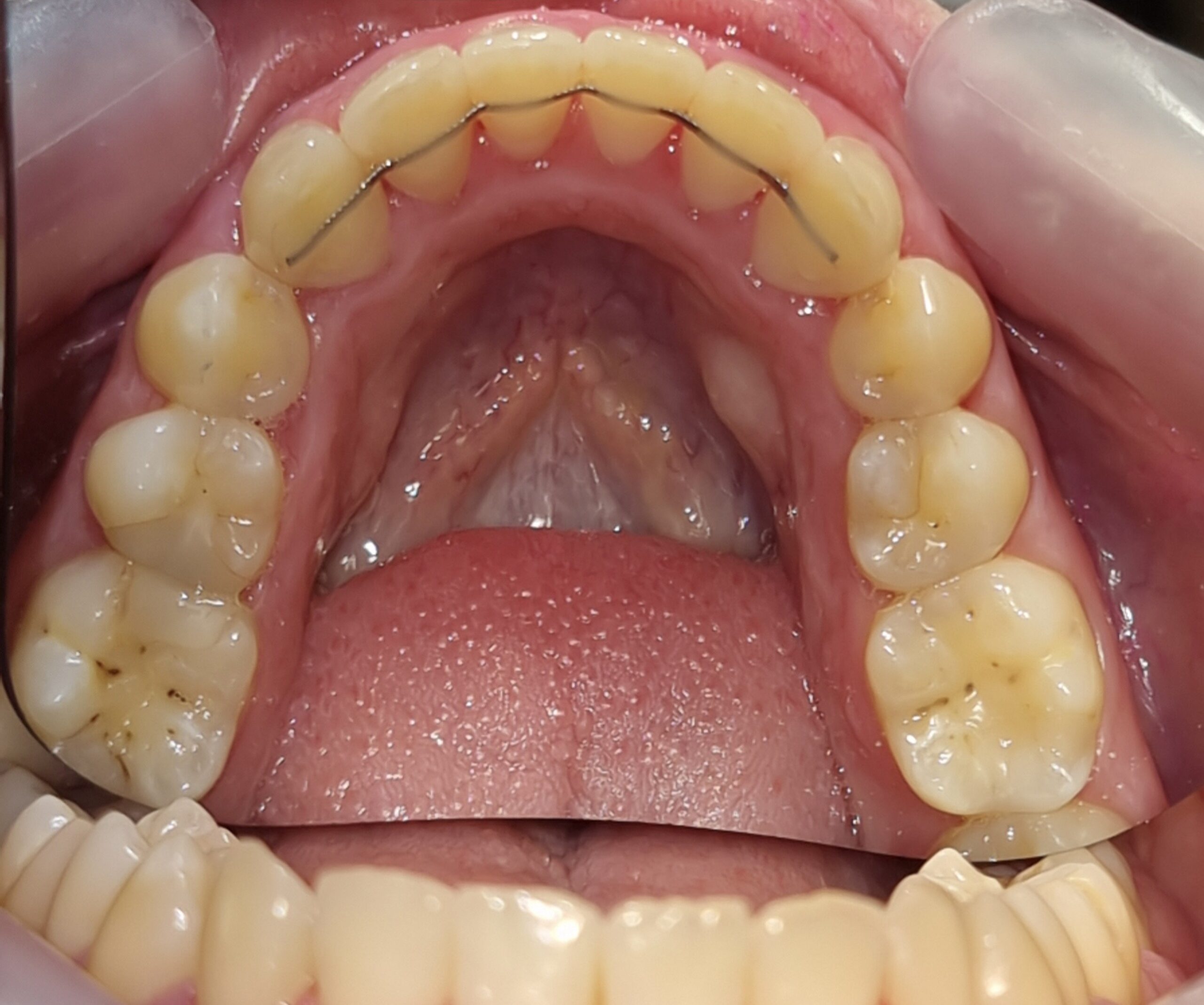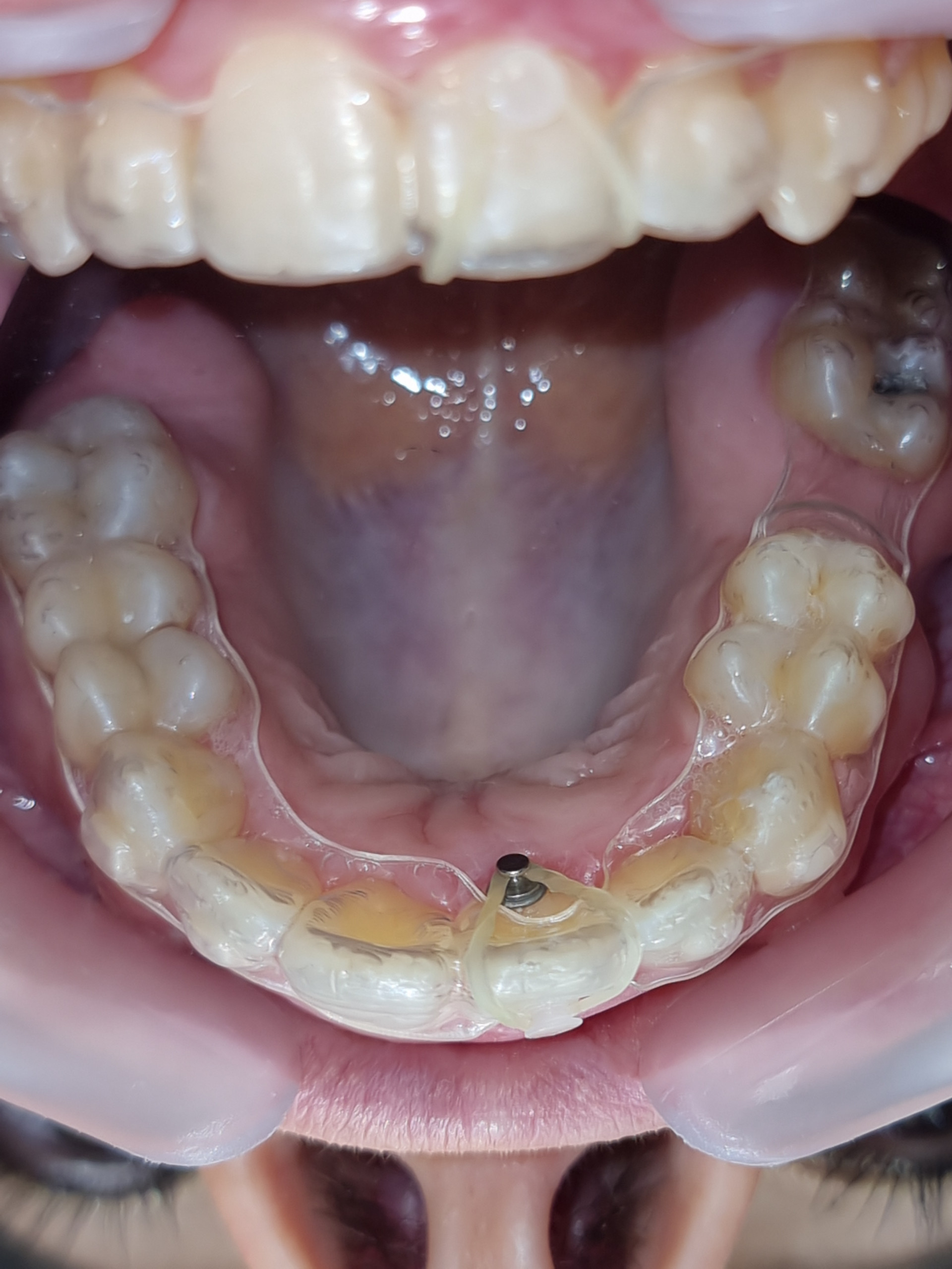 A keresztharapás korrigálásához harapás emelés volt szükséges, ezért az alsó fogívre készült sínekbe terveztük a harapásemelőket. A felső fogív kezelése hosszabb ideig tartott, az alsó fogíven végig passzív harapás emelő síneket alkalmaztak. Minimális expanzió a laterál és front régióban.