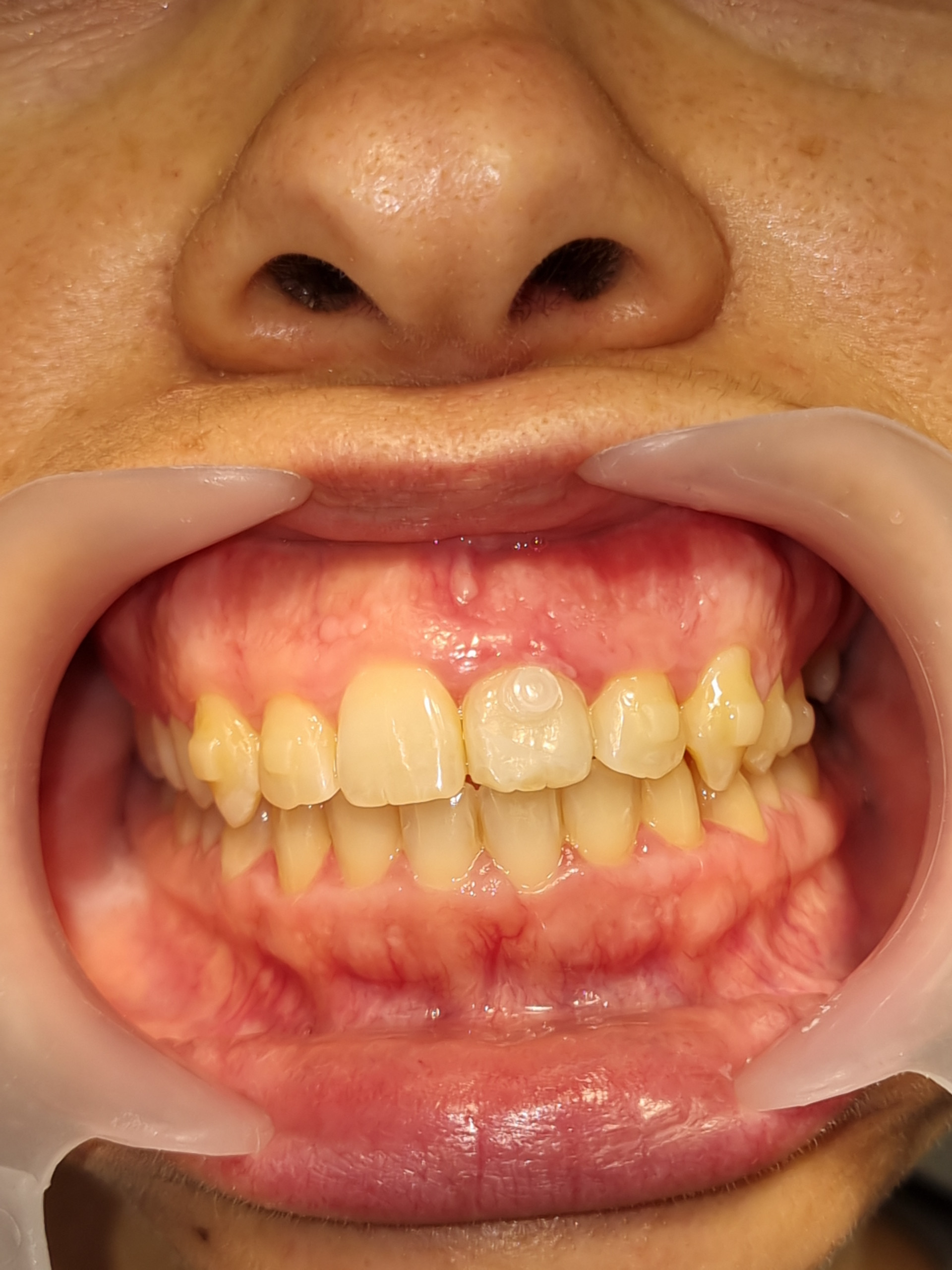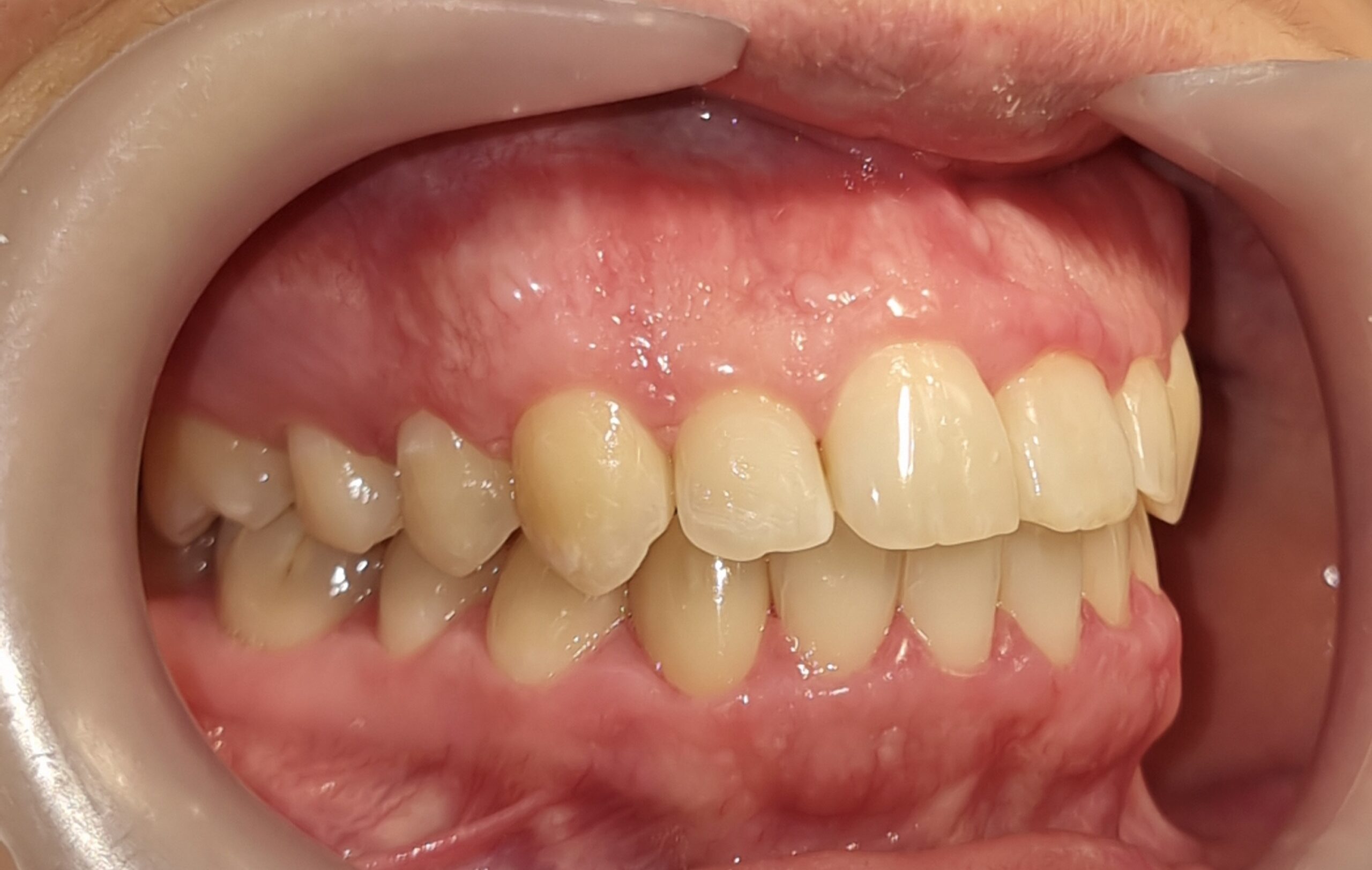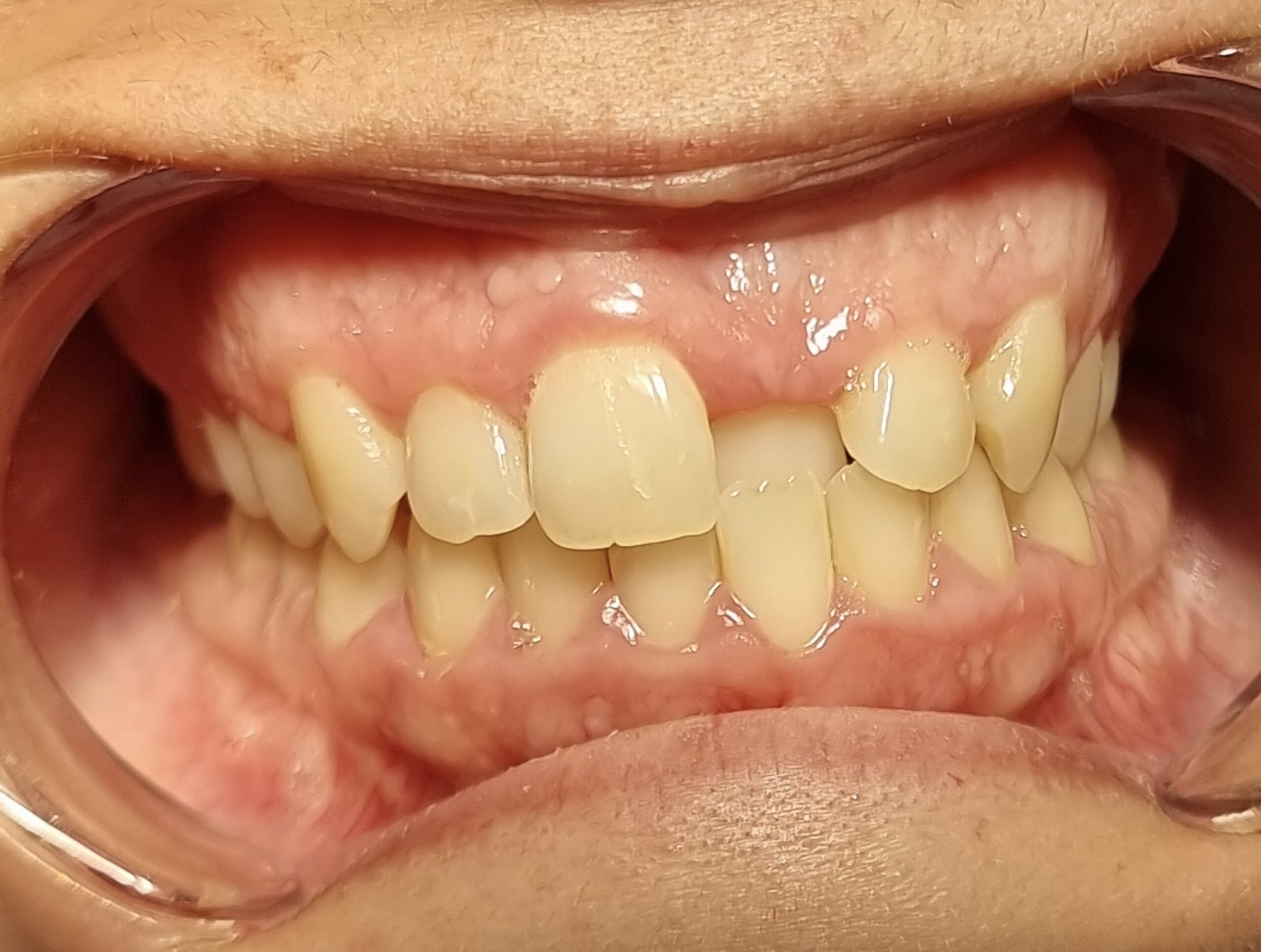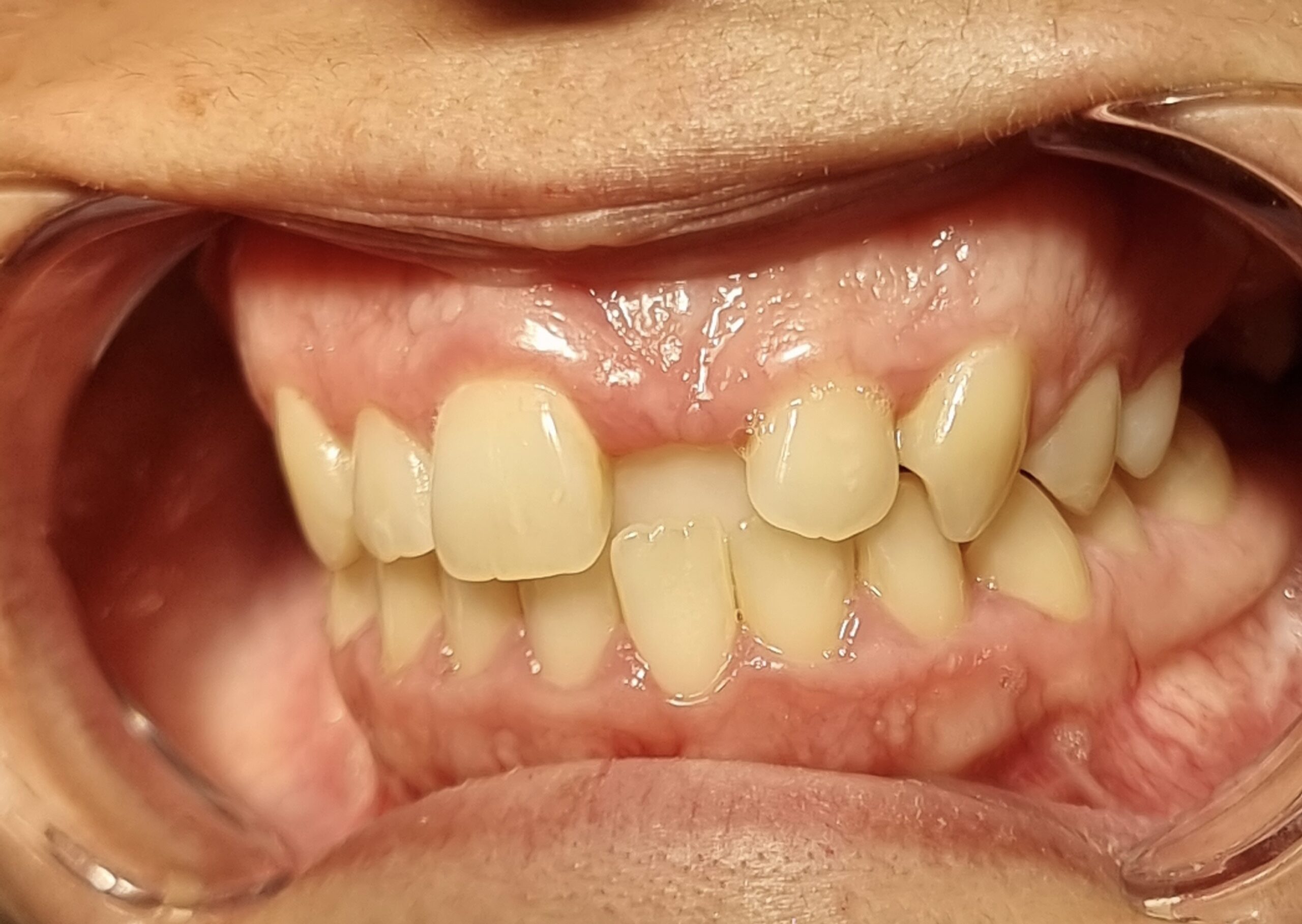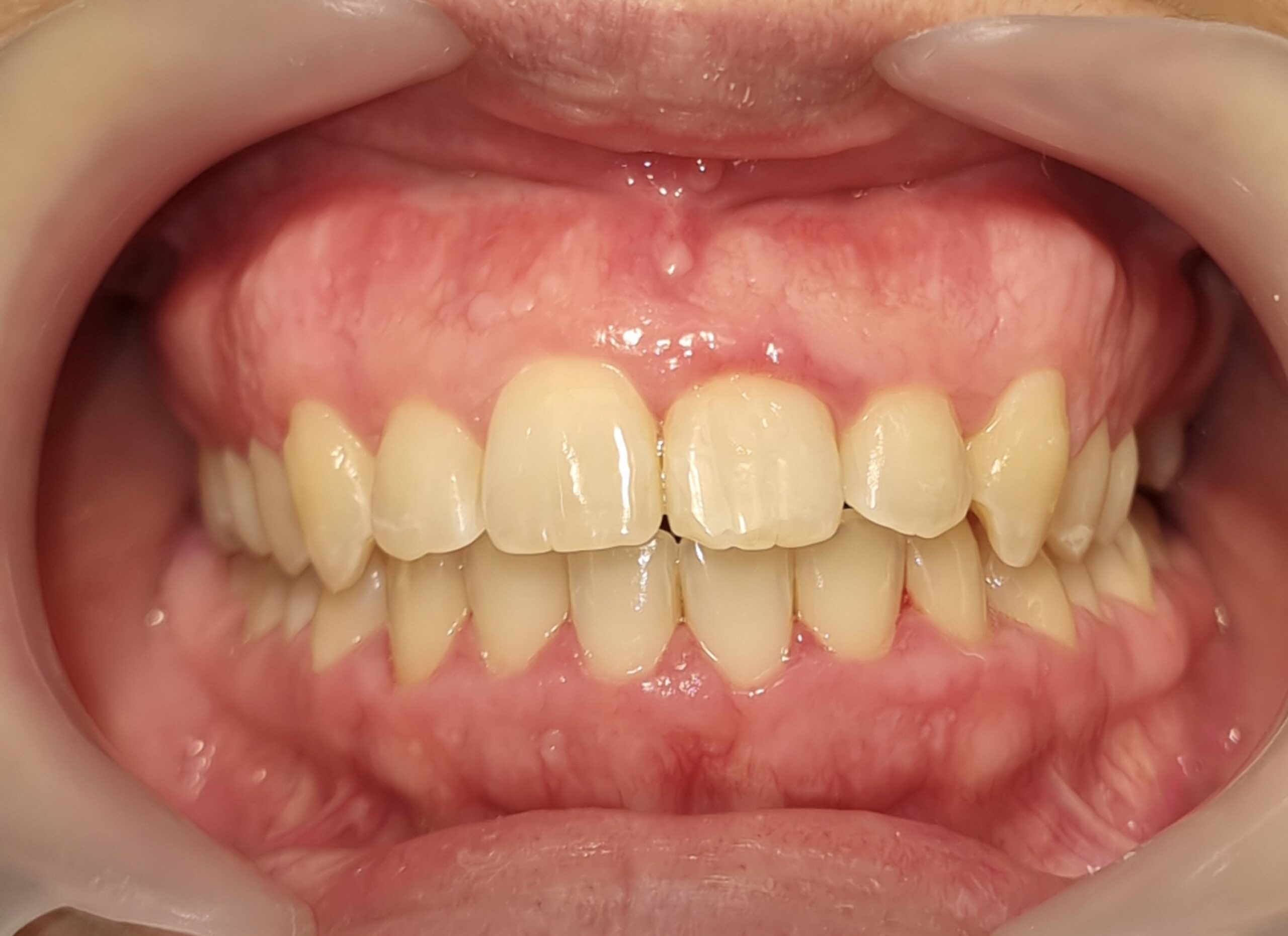 21 fog keresztharásának megoldása, valamint az alsó felső fogak torlódásának megoldása volt a kezelés elsődlegese célja. A páciens Class I. harapással rendelkezett.